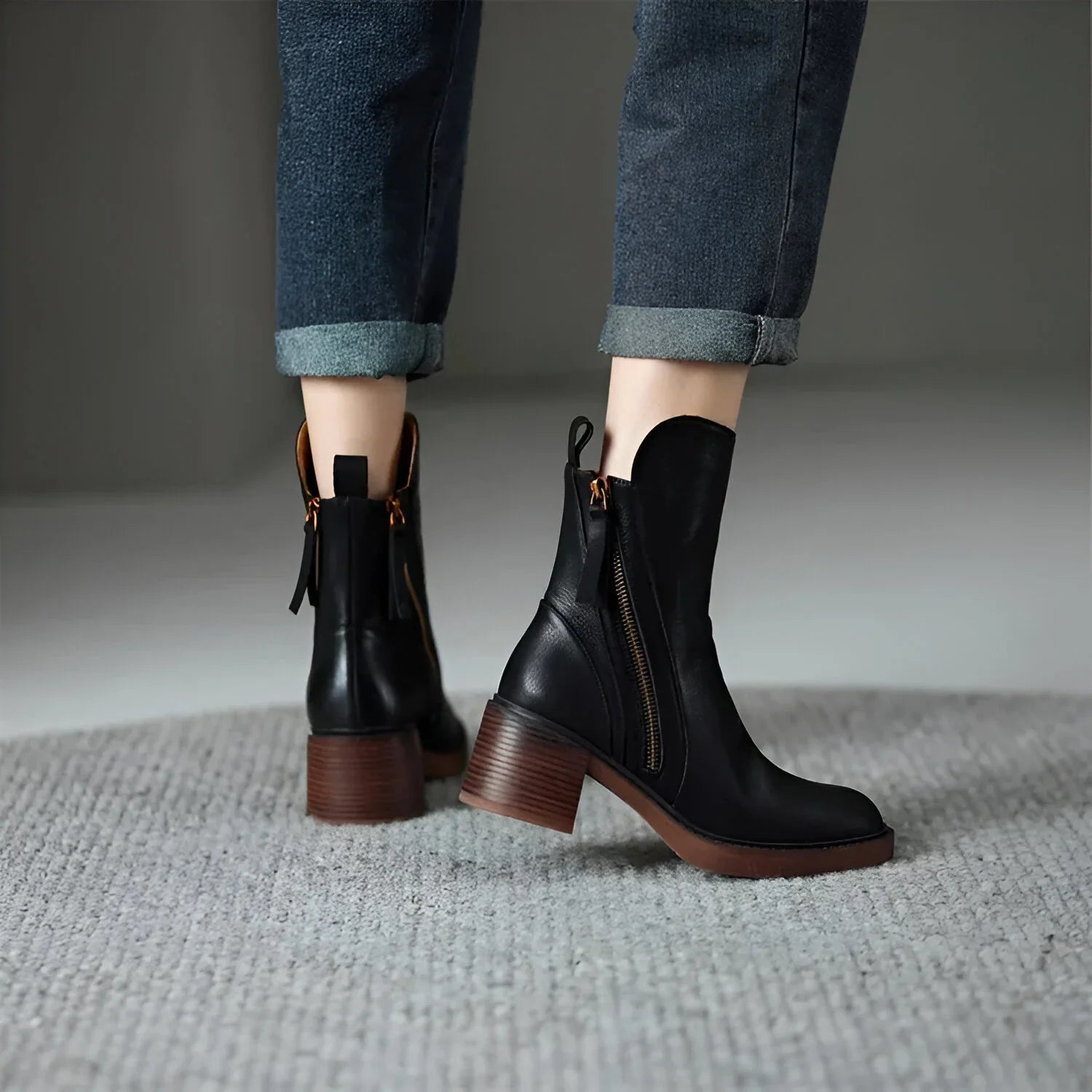 Un design in pelle elegante e lussuoso con punta rotonda e un solido tacco a blocco caratterizzano questi stivali con doppia cerniera per una facile calzata e svestizione, perfetti per i tuoi look nelle stagioni più fresche.